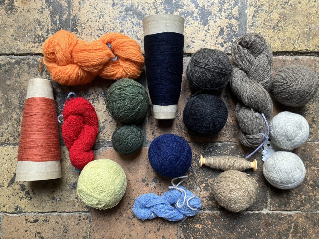 Rewound yarns, coming from our neighborhood recycling project, supply color and pattern in the textiles. With zero water use, pollution, and CO2 footprint, they are the heart of my practice. The rewounds challenge me to continually adapt to unfamiliar yarns and unpredictable supplies.