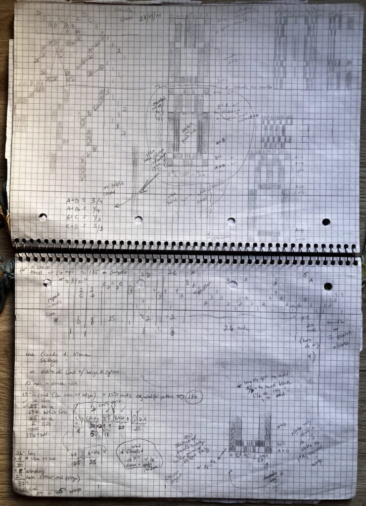 All designs are fully worked out on paper, based on my understanding of weave structures, drafting, and the abstract complexities of interlacing threads on a loom. Nothing is computer generated or made with the aid of weaving software.